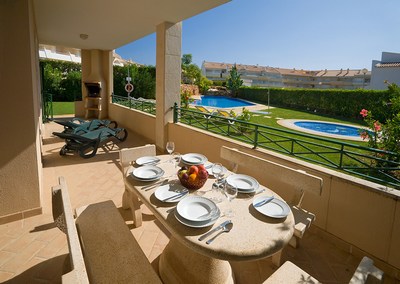 Situated in a prime location in Vilamoura, this beautiful, luxury, apartment is located on the ground floor of a new condominium, it overlooks the large communal swimming pool and garden. The apartment is decorated to a very high standard, is very well equipped and comprises of the entrance hall, shower room, lounge /dining room with seating for six people, cable TV, DVD which also plays CD’s, sofa bed and patio doors opening onto the large terrace with BBQ and patio furniture ideal for Al-fresco meals. The terrace has direct access to the pool area; the kitchen is well equipped with hob, oven fridge/freezer, dishwasher, washing machine with dryer, toaster, kettle, microwave, etc.; a twin bedroom with patio doors that open onto the terrace and the master bedroom with double bed and en suite bathroom which has an hydro massage bath and patio doors opening onto the terrace . There is underground parking. The communal swimming pool and the children’s pool are salted water. There is also a Jacuzzi.